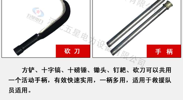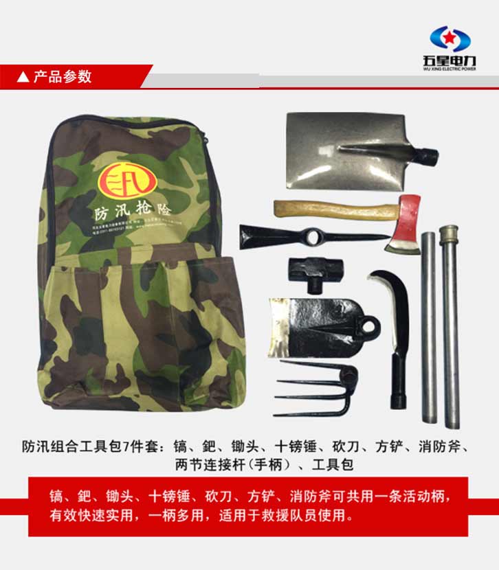 防汛組合工具包七件套:鎬、鈀、鋤頭、十磅錘、砍刀、方鏟、消防斧頭、活動(dòng)柄、工具包。一柄多用,適用于救援隊(duì)員使用