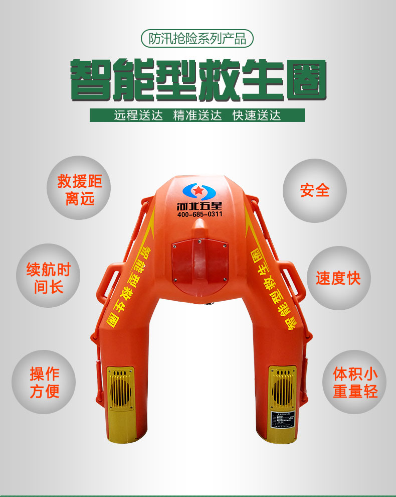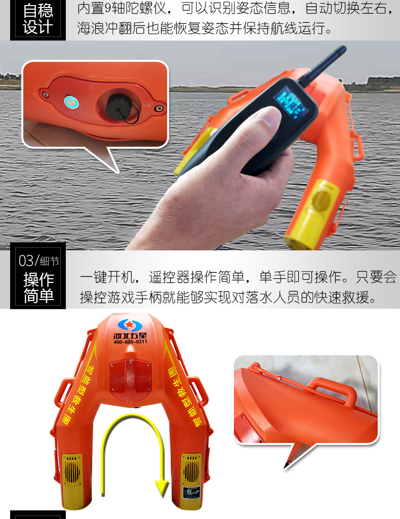 河北五星“霸王龍”WX-500型水上救生遙控機器人(智能型救生圈、智能型遙控救生圈)用于落水人員的救援,時速可達4米/秒,一旦碰到險情,會以很快的速度來到你身邊。智能型救生圈操作簡單,只要會操控游戲手柄就能夠?qū)崿F(xiàn)遠距離、快速、精準送達,實現(xiàn)對落水人員的快速救援。